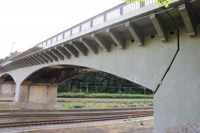 Bogenbrücke, Bogen unter der Fahrbahn, Dreigelenkbogen