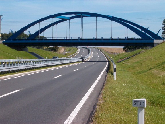 Bogenbrücke, Bogen über der Fahrbahn, Stabbogenbrücke