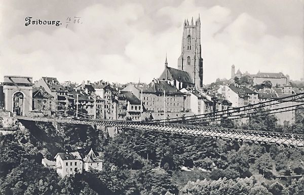 Drahtkabelbrücke- 1923 abgerissen, ersetzt durch eine mehfeldrige Betonbogenbrücke (BAS 1634 - Pont de Zaehringen)
