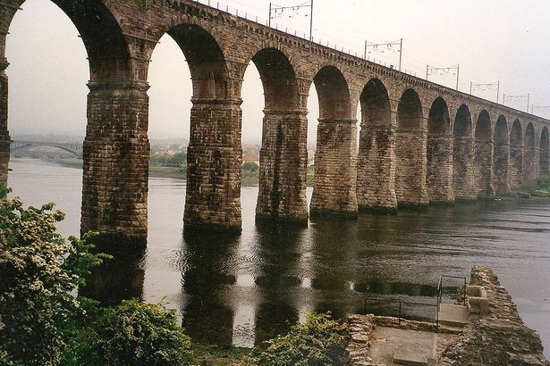 Quelle-WIKIPEDIA: Die Royal Border Bridge ist ein 658 m langes Eisenbahnviadukt zwischen Tweedmouth und Berwick-upon-Tweed. Die Eisenbahn überquert dabei die Mündung des Flusses Tweed in die Nordsee. über 28 Bögen in einer Höhe von 38 m verläuft die East Coast Main Line über die Brücke, die symbolisch mit königlichem Plazet den übergang von England nach Schottland markiert. Der heutige Grenzpunkt befindet sich ein paar Meilen weiter im Norden. Entworfen und erbaut wurde die Brücke unter Leitung von Robert Stephenson zwischen 1847 und 1850 und in einer zwölfminütigen Zeremonie durch Königin Viktoria offiziell eröffnet.