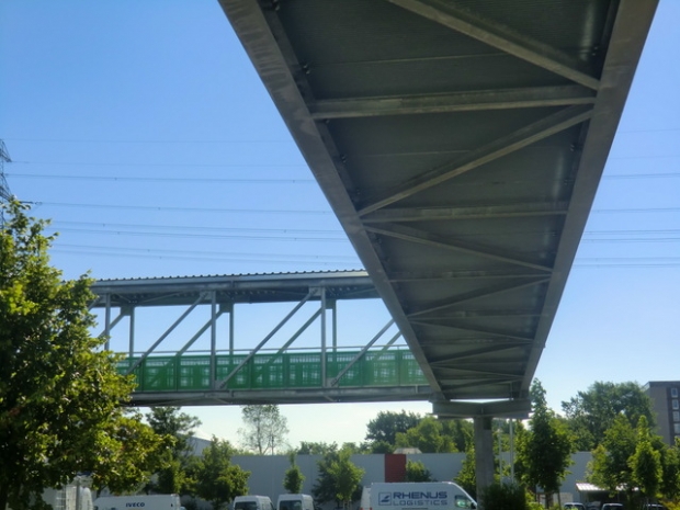 Parallefachwerkbrücke über der Nutzfläche und einem Trägerrost, teileingehaust und bedacht