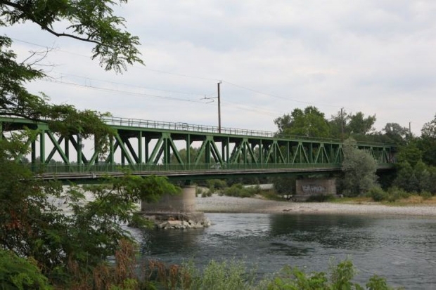 Die Brücke ist doppelstöckig, unten die Strasse, oben die Eisenbahn.