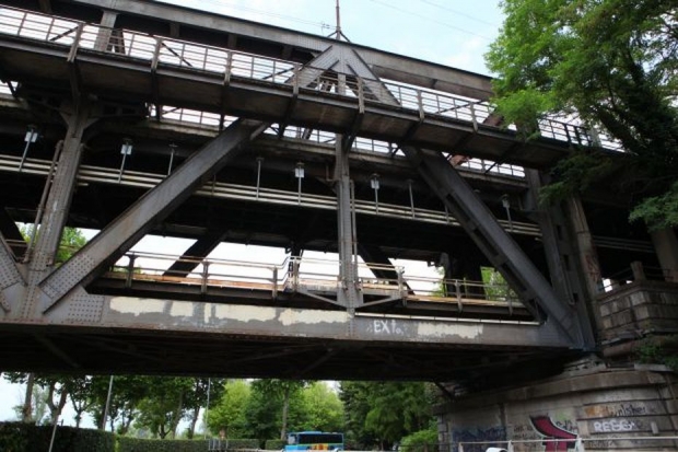 Die Brücke ist doppelstöckig, oben Strasse und Eisenbahn