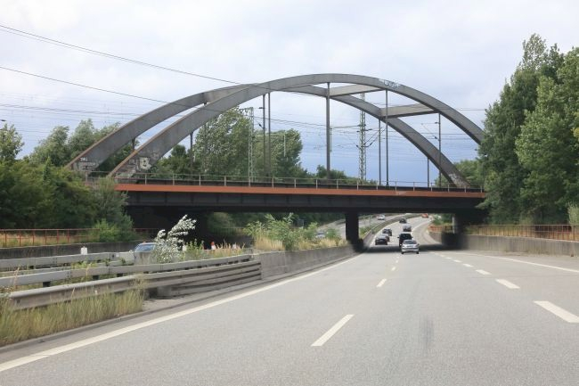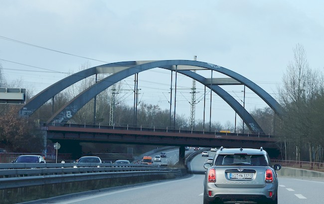 Bogenbrücke, Bogen über der Fahrbahn, Stabbogenbrücke, Balkenbrücke