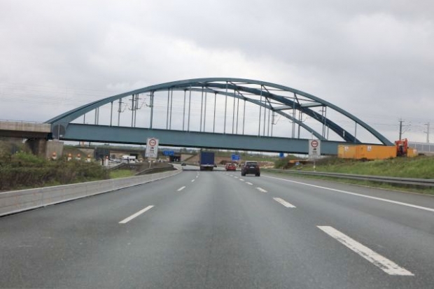 Der Stahlüberbau wurde am 10.05.2014 über den laufenden Verkehr der A3 geschoben.