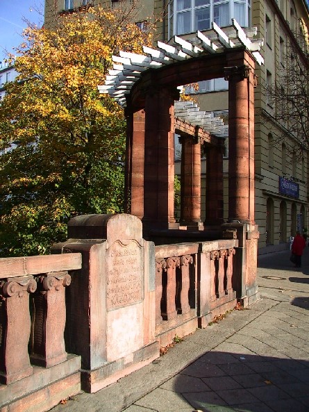Buntsandsteinbrücke über den Lietzensee 1904 durch die "Terrain-Aktiengesellschaft Park Witzleben" (Inschrifttafel) im Zuge der Verlängerung der Kantstraße zur Neue Kantstraße erbaut. Zweiteilung des Lietzenseeparks durch die für die Straßenverlängerung notwendige Dammaufschüttung; erst 1954 wurde durch eine Fußgängerunterwegung unter der Brücke eine Verbindung der beiden Parkhälften hergestellt.