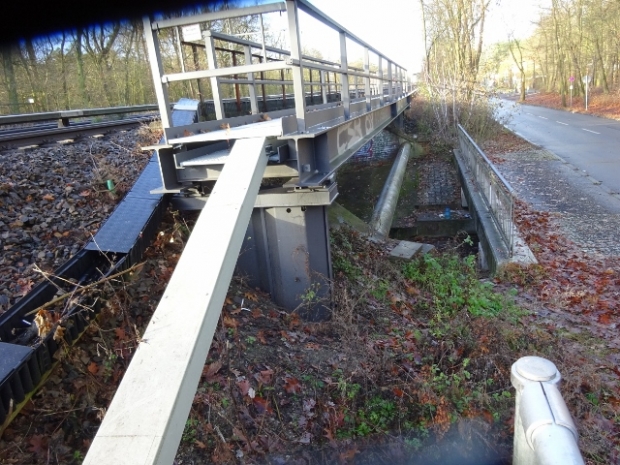 Die Brücke wurde als fertig gestellt am 6.4.2015 vorgefunden.Die zuvor eingerammten Spundwandprofile wurden als Stützen verwendet und da die Brücke mit den Spundwänden verschweißt wurde ist damit das Prinzip der Baues einer Brücke als Träger auf 2 Stützen das immer ein festes und und ein loses Lager hat nicht vorhanden wie es einmal angedacht war. Ich ändere deshalb die Brücke in eine Rahmenkonstruktion um. Helmut Fischer