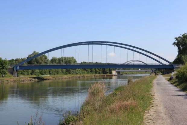 Bogenbrücke, Bogen über der Fahrbahn, Stabbogenbrücke