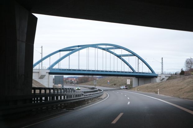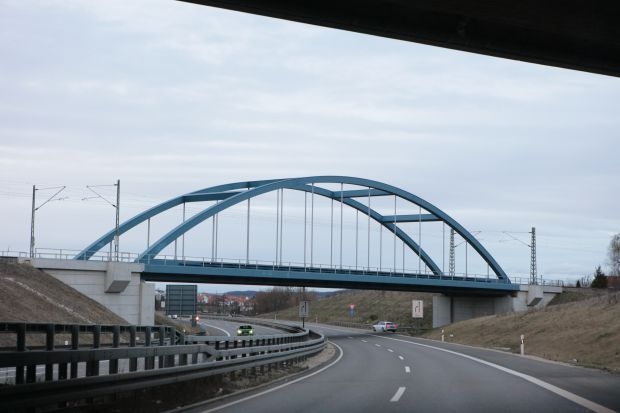 Bogenbrücke, Bogen über der Fahrbahn, Stabbogenbrücke
