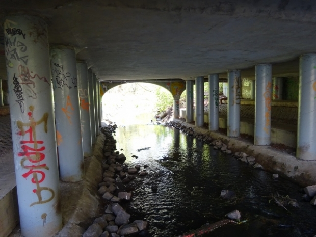 Korbbogenbrücke unter der Fahrbahn, 3 Felder mit einen Komplettbogen in der Mitte und 2 halben Bögen an seinen Brückenrändern alles zusammen an den beiden Außenseiten der Brücke. Im Innern der Brücke eine Stahlbetonplatte über die Felder und Stützen