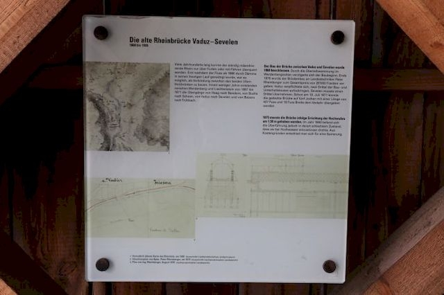 Die erste Rheinbrücke zwischen Vaduz und Sevelen wurde in den Jahren 1870/1871 errichtet. Die Kosten trugen dabei zu zwei Dritteln die Gemeinde Vaduz und zu einem Drittel die Gemeinde Sevelen, wobei sich auch das Land Liechtenstein am Vaduzer Kostenanteil beteiligte. Der Vorgängerbau hatte eine Länge von 135 Metern und eine Breite von ca. 5 Metern. Aufgrund der Erhöhung der Rheindämme musste die Brücke in den Jahren 1874/1875 und 1886 zweimal angehoben werden. Der schlechte bauliche Zustand machte schliesslich einen Neubau notwendig.[2]