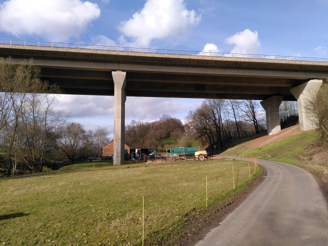 in the immediate vicinity of the evening Valley mill<br>The building is located in a left turn with R = 9000 m as well as regarding the height development in a tub with R = 27000 m at a medium-sized longitudinal gradient of 0.95% in the East. Two separate, 199 m long continuous beams with spans were built by 29 + 3 x 47 m + 29 m. It was built as special proposal in prestressed concrete instead of the official draft, which called for a two-part steel composite superstructure. T-beams was elected the two dock-side superstructure with 2,915 m cantilevered deck, so that a balanced cross section resulting in a bridge between 6.30 m. The 1.50 m wide bridges received a suit by 10 cm. The construction height is 2.30 m. The two adjacent buildings are supported by depending on a number of pillars. The octagonal in plan cross-section of pillar is designed from a rectangle with the dimensions 2 m times 5 m. In the head section of the cross section to the arrangement of the bearings is widened karitellartig to a rectangle of 3 m times 8 m. The sloping sides and the side, 1.20 m are characteristic for the pillar diameter wide and 0.35 m deep, rectangular constrictions. The bevels and cut-outs create significant light and shadows on the pillars and allow a freer perspective under the bridge at bias review. The pillar broadsides were a suit of 1:80.<br>Construction by: shaft Nordhausen GmbH, special construction by Bauer Spezialtiefbau GmbH
