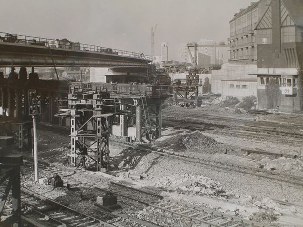 Blick vom Osten auf die Lichtenberger Brücke, im Hintergrund der Vormontageplatz mit Portalkran, weiter hinten der Wohnkomplex Frankfurter Allee Süd