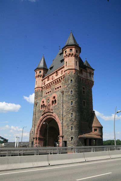 Information provided by Jens Bitsch:<br><br>Approx. 320 metres length without ramps. 2 Tracks plus 2 lanes for pedestrians.<br>The Tower comes from the middle ages, but was built in the architectural style of the Nibelungen. The bridge tower on the other side of the Rhine was destroyed in the second world war. The bridge received your Tower hoods which were removed during the second world war to install anti-aircraft 1990 again.