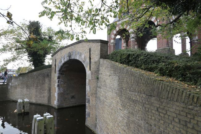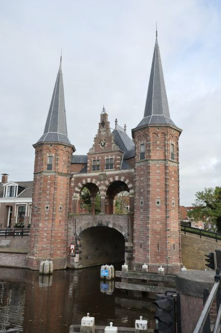 City gate on a waterway, with turrets