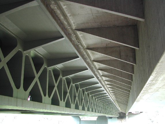 The free cantilever building built over consists of two 6.60 m high prestressed concrete trusses with a longitudinal and transverse sheet deck 23.5 m wide. A pedestrian and cycle path after kind of a double-deck bridge is located on the lower deck of the construction. The bridge spans the Mangfall Valley at an altitude of about 63 m spans from 90 + 108 + 90 = 288 m. The total cost was approximately 7.3 million DM including the construction of bicycle and sidewalk connections. A simple box girder tie-concrete beams for the extension of the motorway has been built next to the truss structure.