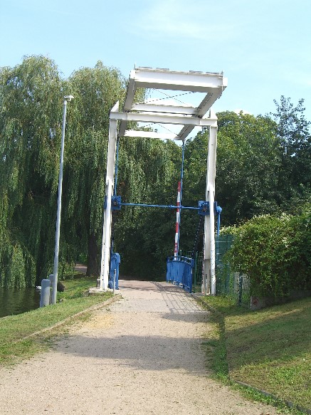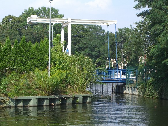 This small port facility was created but never used in connection with a Wohnungsbaustandort on the edge of the river Spree and the Salvador Allende Street.The bridge more so through all spree border day trippers.<br><br>A movable bridge (balance beam bascule bridge) was built due to the planned clearance for boats of 4.00 m.<br><br>The bridge consists of a welded steel construction, the superstructure was a wooden flooring. The folding process is carried out using 2 racks, which are electrically moved via rack and pinion winches.<br><br>The electric motor in the fenced area on Southwest side is served exclusively by the coxswain.New paragraph: