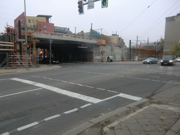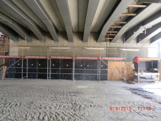 The first superstructure of the south bridge spanning Karlshorterstraße still exists, as does an older superstructure, designated BAS 9089, which still carries one track. The abutment between the two superstructures was demolished today, June 2, 2015. The demolition process is documented in photos from June 2, 2015. Helmut Fischer The intermediate abutment has been demolished, and work is beginning to rebuild the gap. See the photos from August 8, 2015. Helmut Fischer
