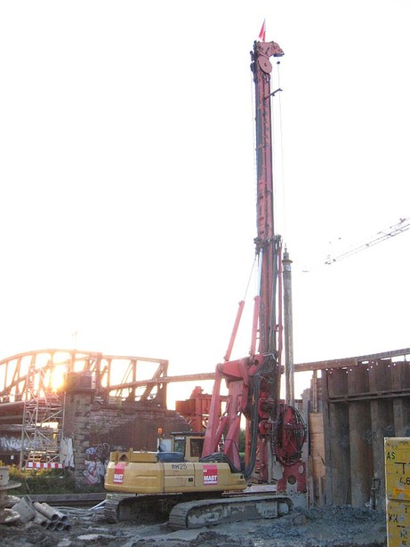 Herstellen der Gründung auf der Ostseite. Im Hintergrund ist die alte, schon außer Betrieb befindliche Brücke zu sehen.