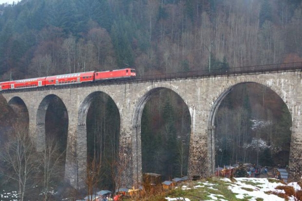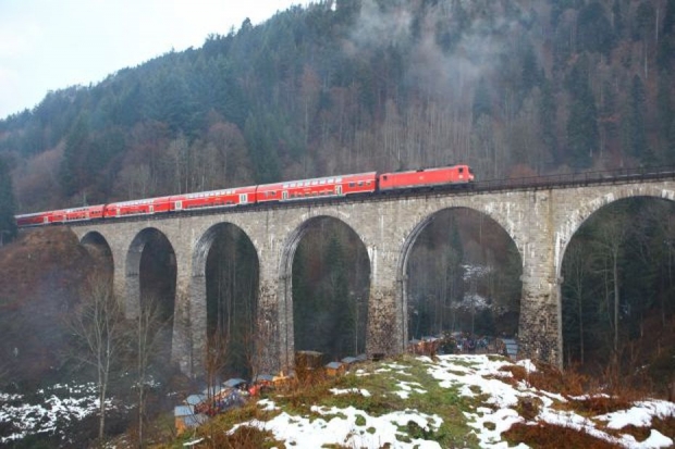 Ravenna viaduct replaced truss bridge built in 1884. Part of the Höllentalbahn (Freiburg-Neustadt / Switzerland). 9 Arches. Blown up by the army in April 1945, but renewed in 1948 in their original state.<br><br>Information by Heidi Zahir:<br>The Deutsche Reichsbahn-Gesellschaft was planning to abolish the expensive gear operating on the Hölle Valley railway at the beginning of the 1920s. For the envisaged heavy adhesion locomotives, track and bridges had to be strengthened. The 1887-built Ravenna viaduct you decided however for a complete rebuild, as was the old building in a contra-rotating arc and was allowed to be used only at 15 km/h. in 1925 work began on Dec. 14, 1927, the first train of the new viaduct rolled. 224 Feet long was the building and thus the largest railway bridge in the black forest. The distinctive viaduct crosses the romantic Ravenna Gorge with nine arches 20 m clear span. At the highest point of the track body is about 40 m above the valley floor. On April 23, 1945 so 14 days before the end of the war, German pioneers blew the pillars 3.4 and 5 and thus the vaulted 3 to 6 in the air during the retreat. Two years and eight months it took to the viaduct was rebuilt. Since then, the trains roll every day over a railway bridge, which has lost none of its elegance to the present day.<br>In 1936 it was electrically uphill.