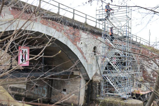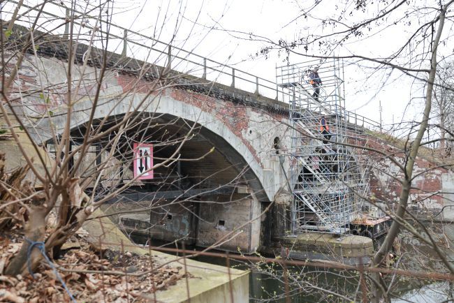 The listed railway overpass was built in 1902 as a double-track arched bridge spanning the South Canal with two arches. (See Annex 03.901.1 for the entry in the list of monuments).