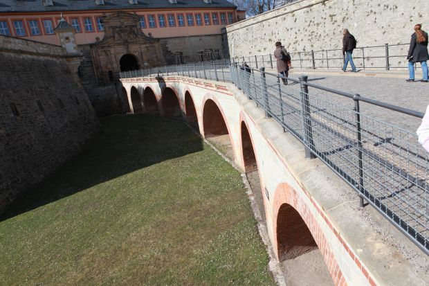 It was built in 1670 as a wooden pile bridge, a domed 1864 and renovated in 1990/91<br><br>8 Barrel<br><br><br>Information by Heidi Zahir:<Br><br>This bridge spans the former moat and empties into the gate of the Commander's House. The first building was a pure wood construction. The intermediate piers of stone masonry were later built, on which a wooden superstructure was mounted on. in 1864 was in its present form, using the old lower pillar shafts. The new face brick stone walls in combination with the natural stone masonry of arch view area and Pier shafts, as well as the articulated cornice give the bridge its characteristic appearance.<Br><br>With the softening of the town and the citadel in 1873, the bridge lost its actual meaning. The moat has been partially filled and the vaulted openings used as warehouses and later garages. Beginning immediately after the German reunification rescheduling for the rehabilitation of the old town core of Erfurt comprised also the transformation of the complex Petersberg.<Br><br>1992 was begun to restore the access bridge to the Citadel and their immediate environment in the State from 1864. The length of the bridge is about 50 m and consists of 8 fields with Diametres from 2.70 to 6.40 m. First had to the bridge "be free". To a floor removal of about 600 m was required. The actual repair work included essentially<Br><br>-the clearing of the vault population and their replacement by filling concrete<Br>-the new on brickwork of the outer arc ranges and the front walls<Br>-the sealing of the building<Br>-the restoration of the old moldings and railings<Br><Br>The existing old material was reused in addition as possible.